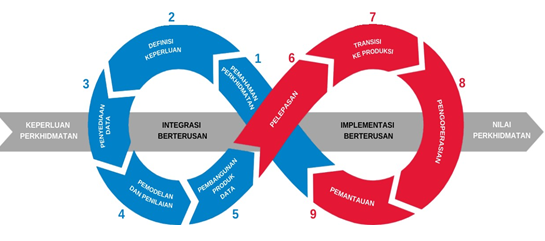 Kitaran metodologi ini melibatkan integrasi dan implementasi berterusan bagi memastikan produk data yang dibangunkan sentiasa berupaya membantu menjawab soalan perkhidmatan/bisnes yang ditetapkan.